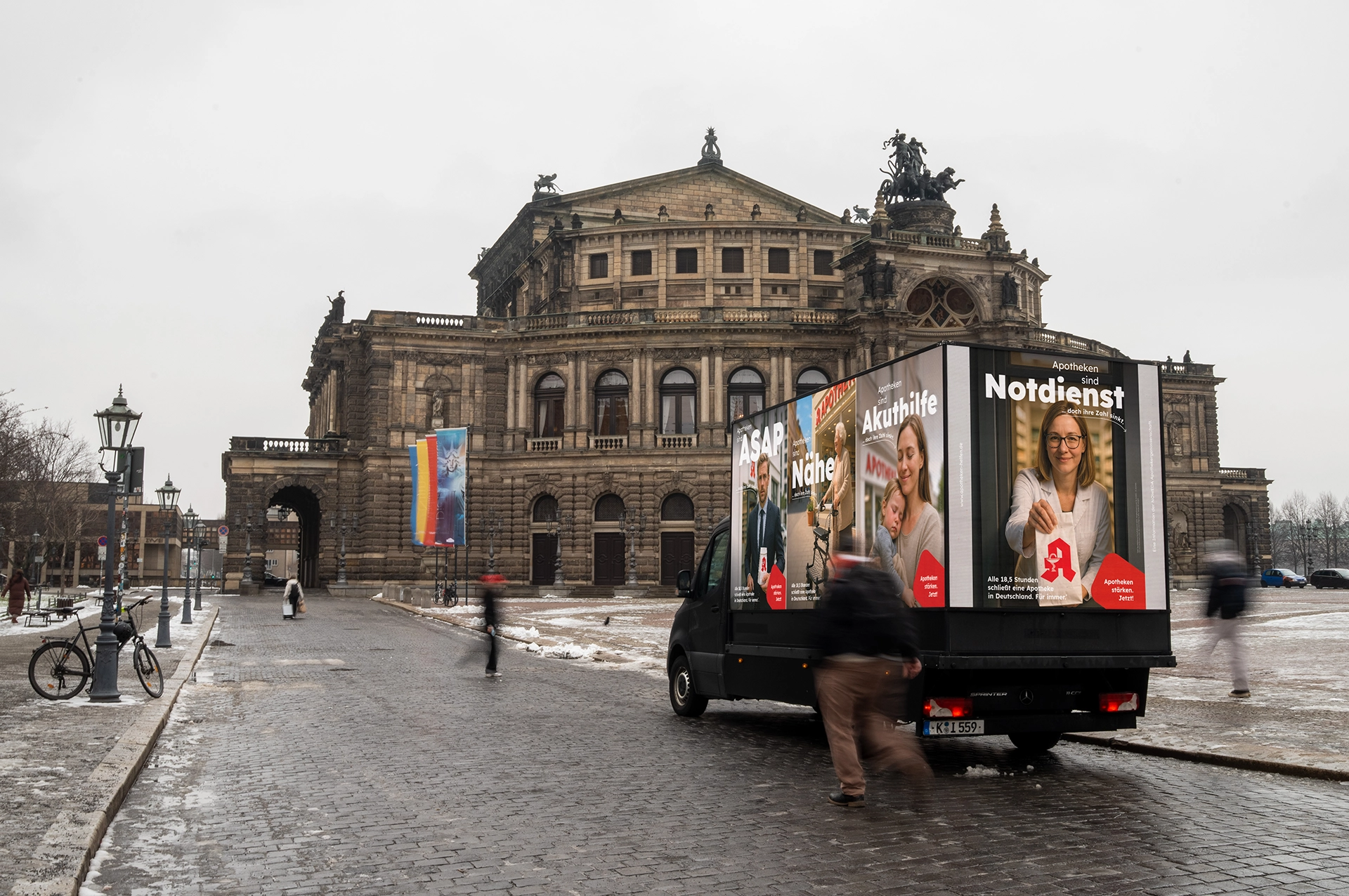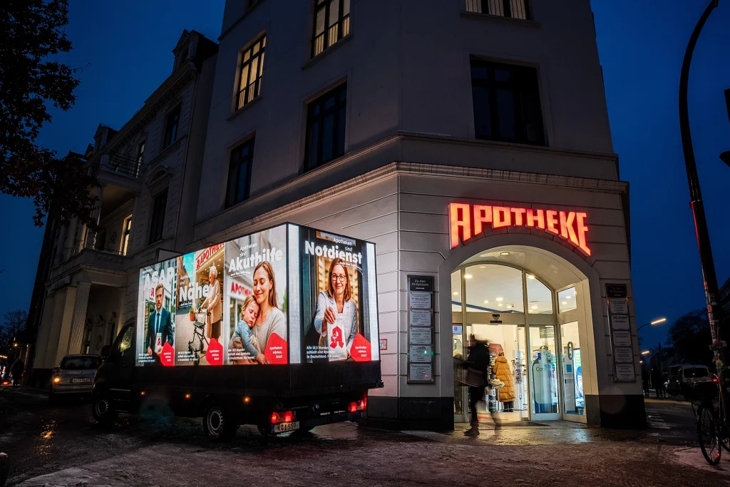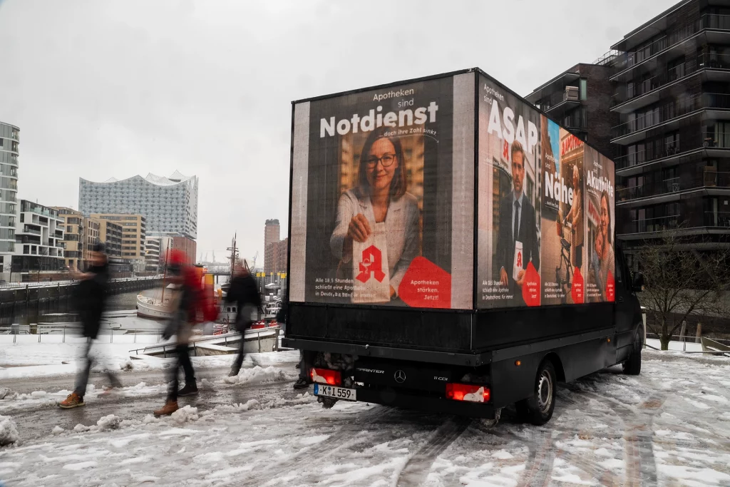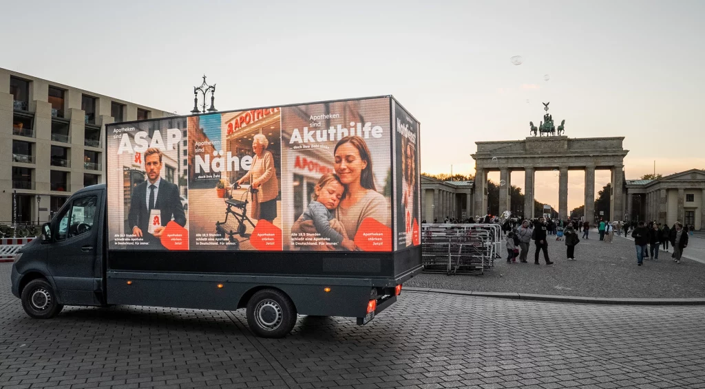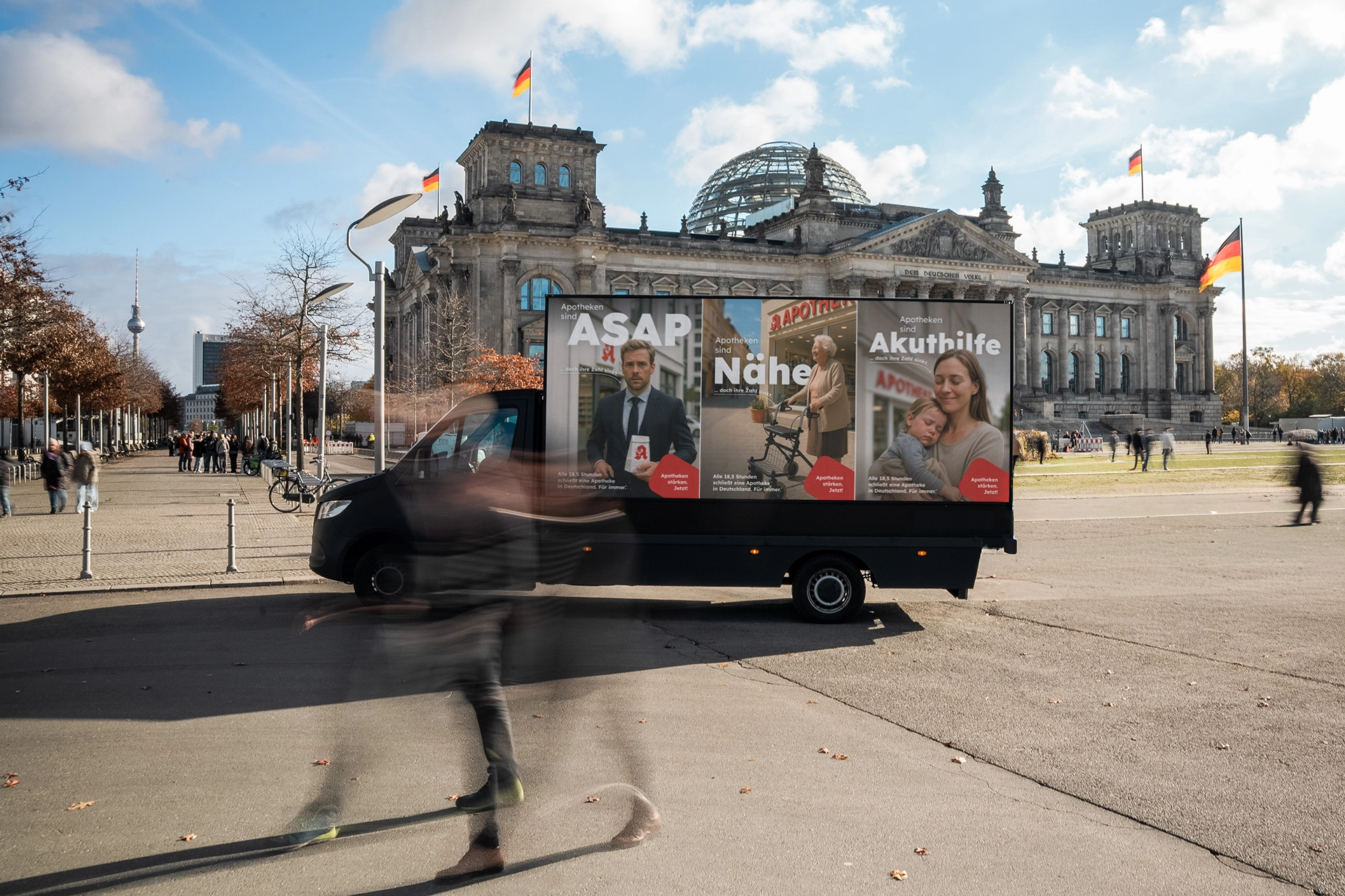 Per unübersehbaren LED-Panel-Truck und über Großprojektionen wurde die Kampagne sowohl im Herzen des politischen Berlins als auch in verschiedenen Großstädten sichtbar. Ob Bundesgesundheitsministerium, Reichstag oder Landtag NRW – die Kampagne macht bundesweit auf die Belange der Vor-Ort-Apotheken aufmerksam.